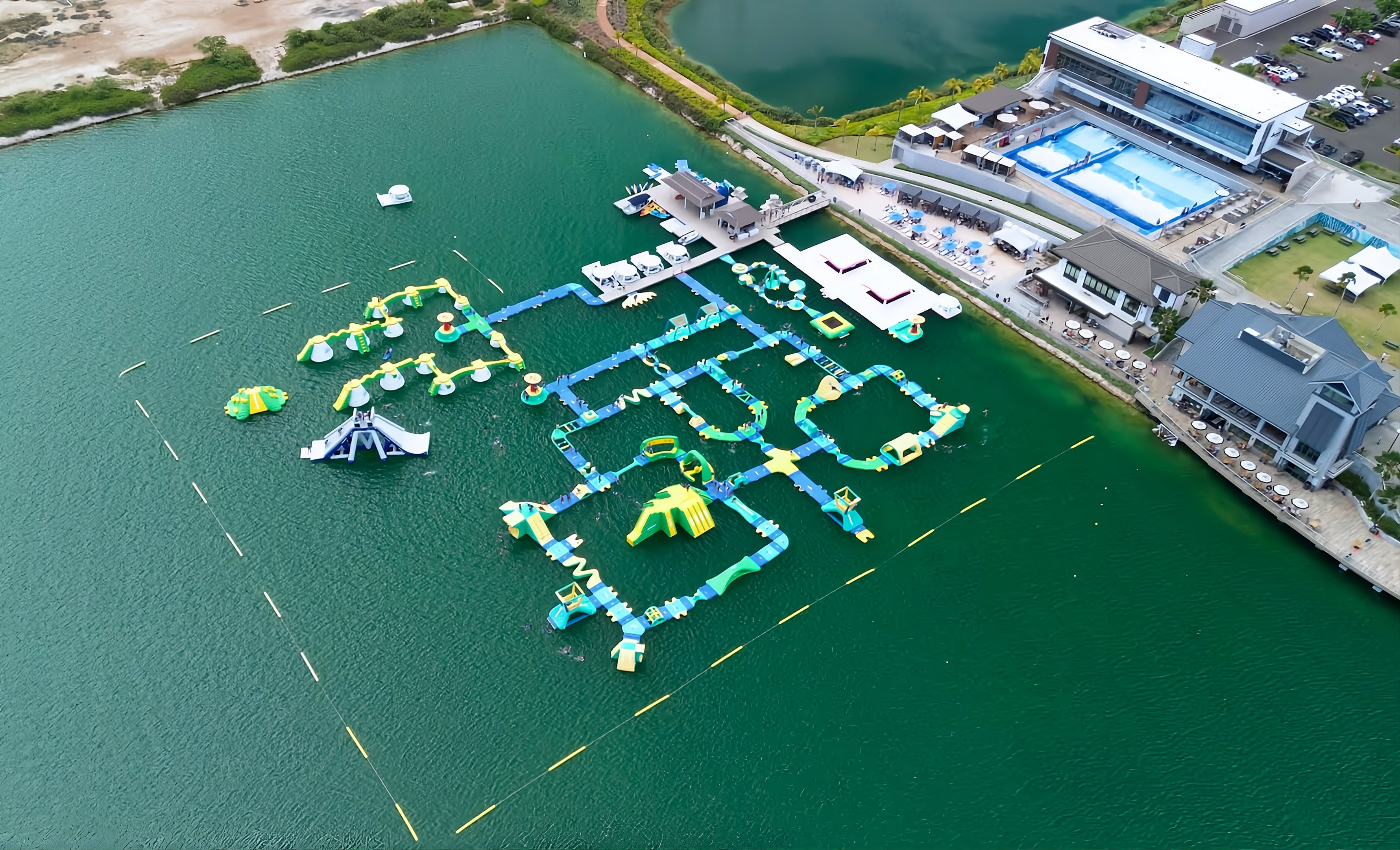 The on-the-water playground offers an exciting experience for the entire ohana, with its series of interconnected inflatables featuring peaks, monkey bars, slides, wiggle bridges, balance beams, planks, hurdles, and more.