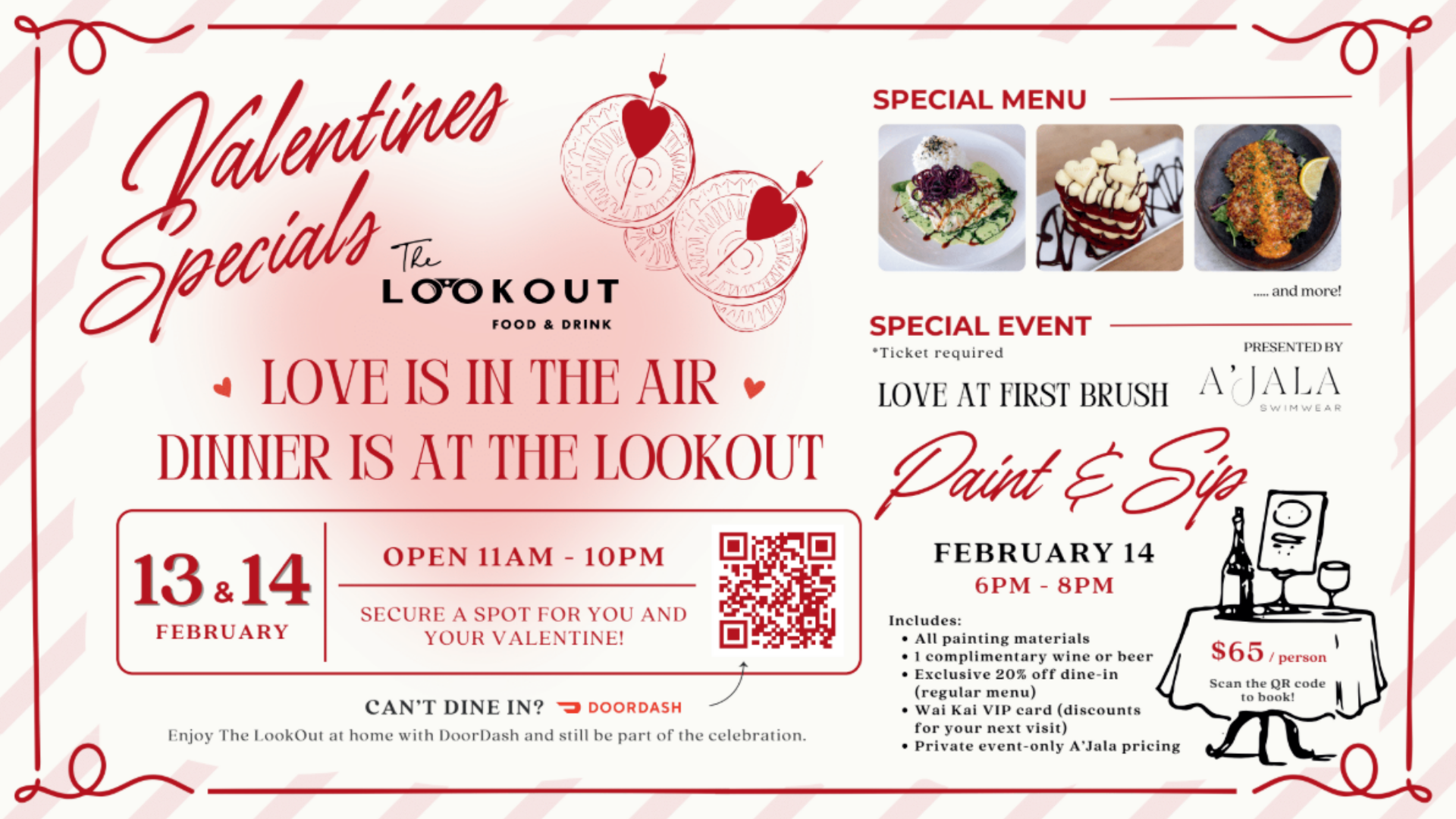 Not to mention, live music and DJ sessions keep the vibes flowing, while panoramic views of the Wai Kai Wave, lagoon, and Diamond Head will leave you smiling. Whether it's a date night, family gathering, post-surf celebration, or just a night out with friends, The LookOut is your place. Don't miss our signature dishes like the Kalua Pork Nachos or Roasted Veggie Bowl, and quench your thirst with a refreshing "Wai Tai" cocktail. Top it all off with our legendary Strawberry Guava Parfait, and you've got a night to remember!