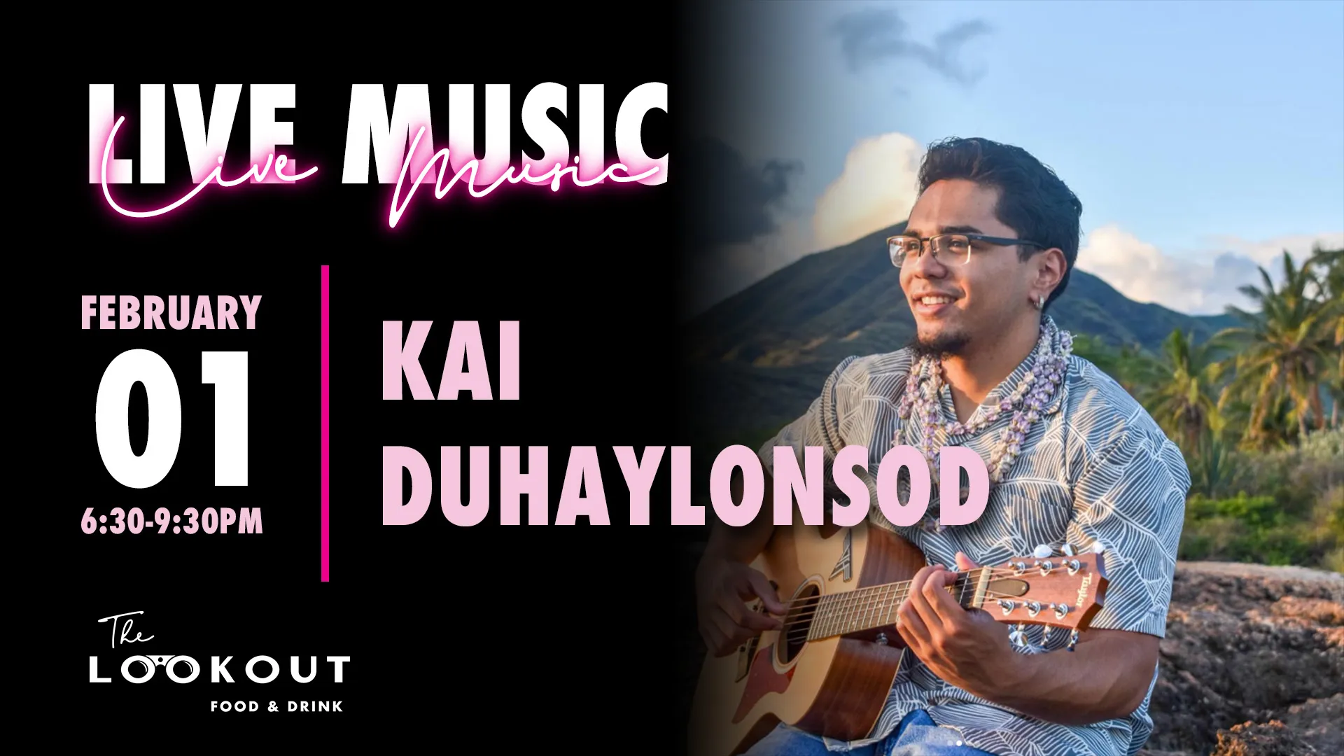 Enjoy LIVE music by Kai Duhaylonsod at The LookOut while enjoying ono food and delicious cocktails! Come early for Pau Hana grindz from 4-6pm!