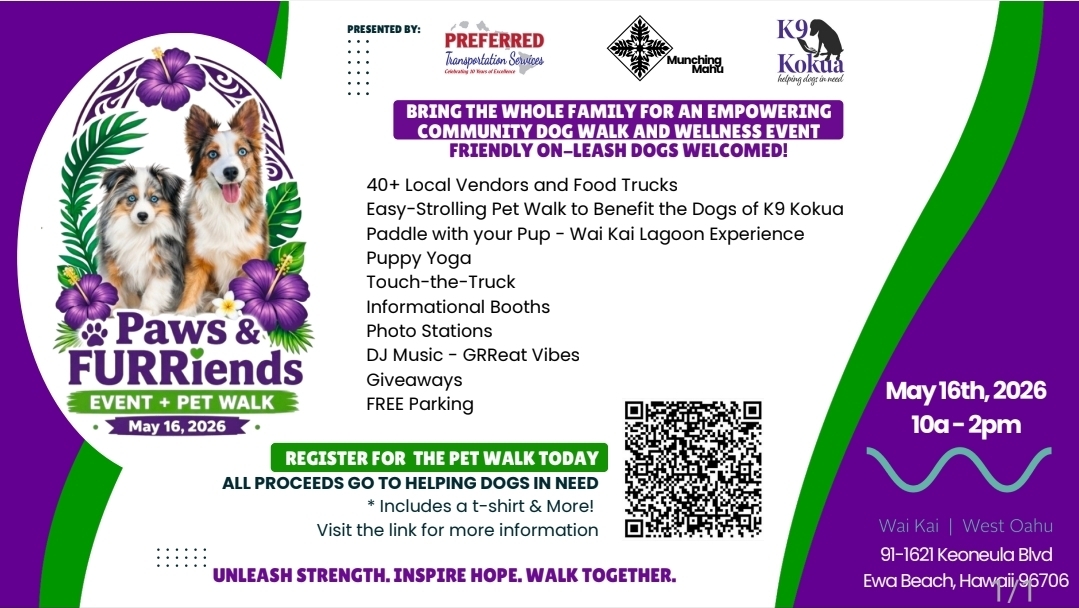 Join the fun at Wai Kai in Ewa Beach for a family-friendly event and Pet Walk in support of all things pawsitive!