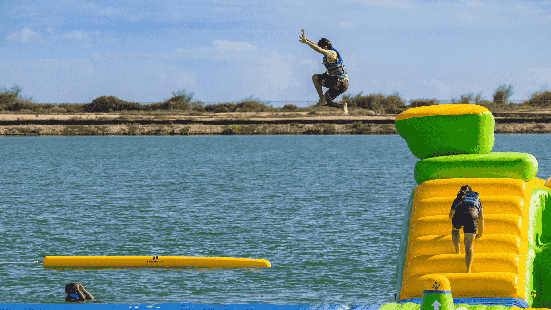 - Access to floating playground & obstacle course with 20+ interconnected features like slides, beams, towers and more!