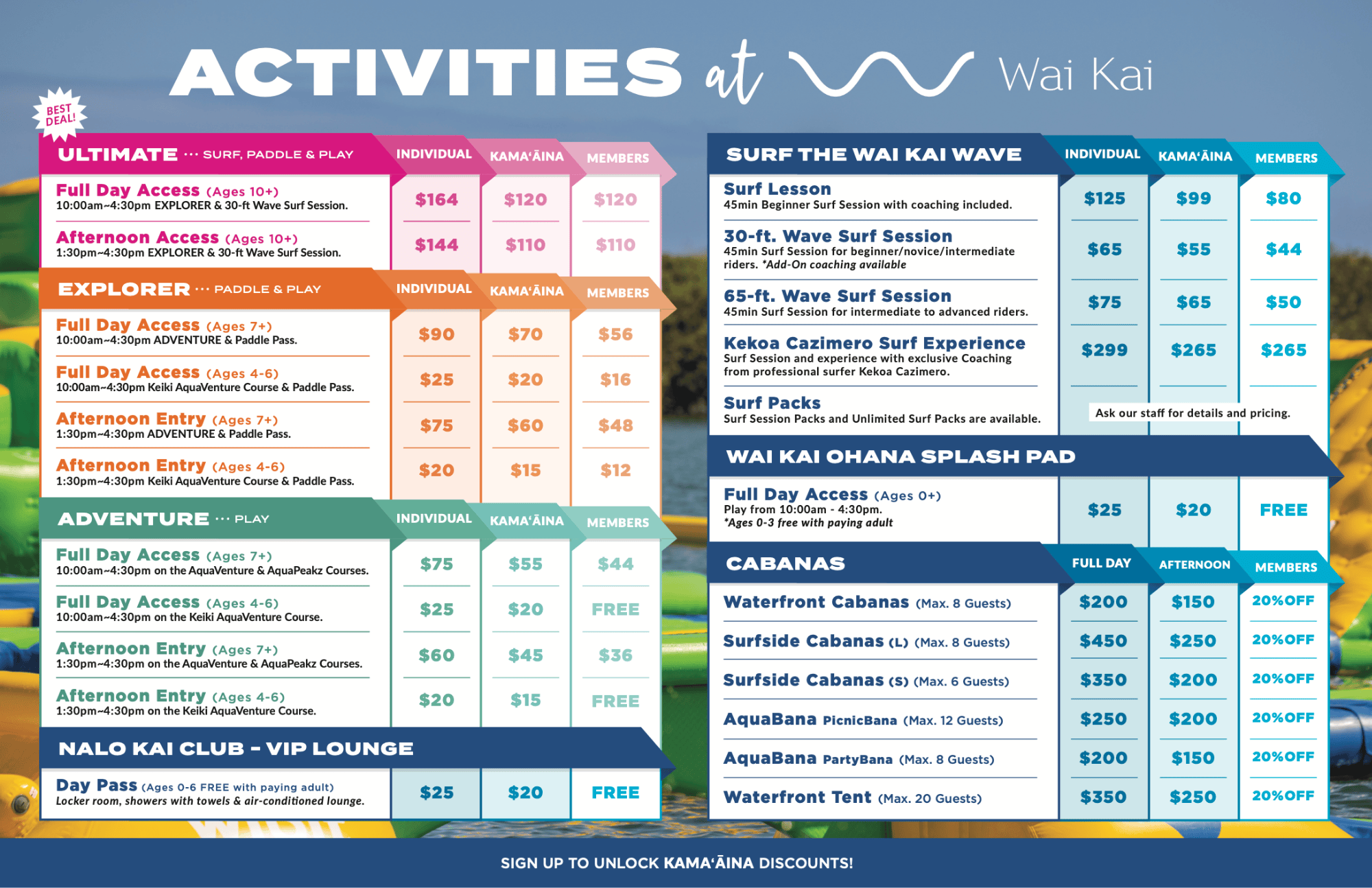 Age Suitability: Lagoon activities are suitable for ages 4 and above, with specific courses designated for children (Keiki Course for ages 4–6) and adults (Aloha Course for ages 7 and above).