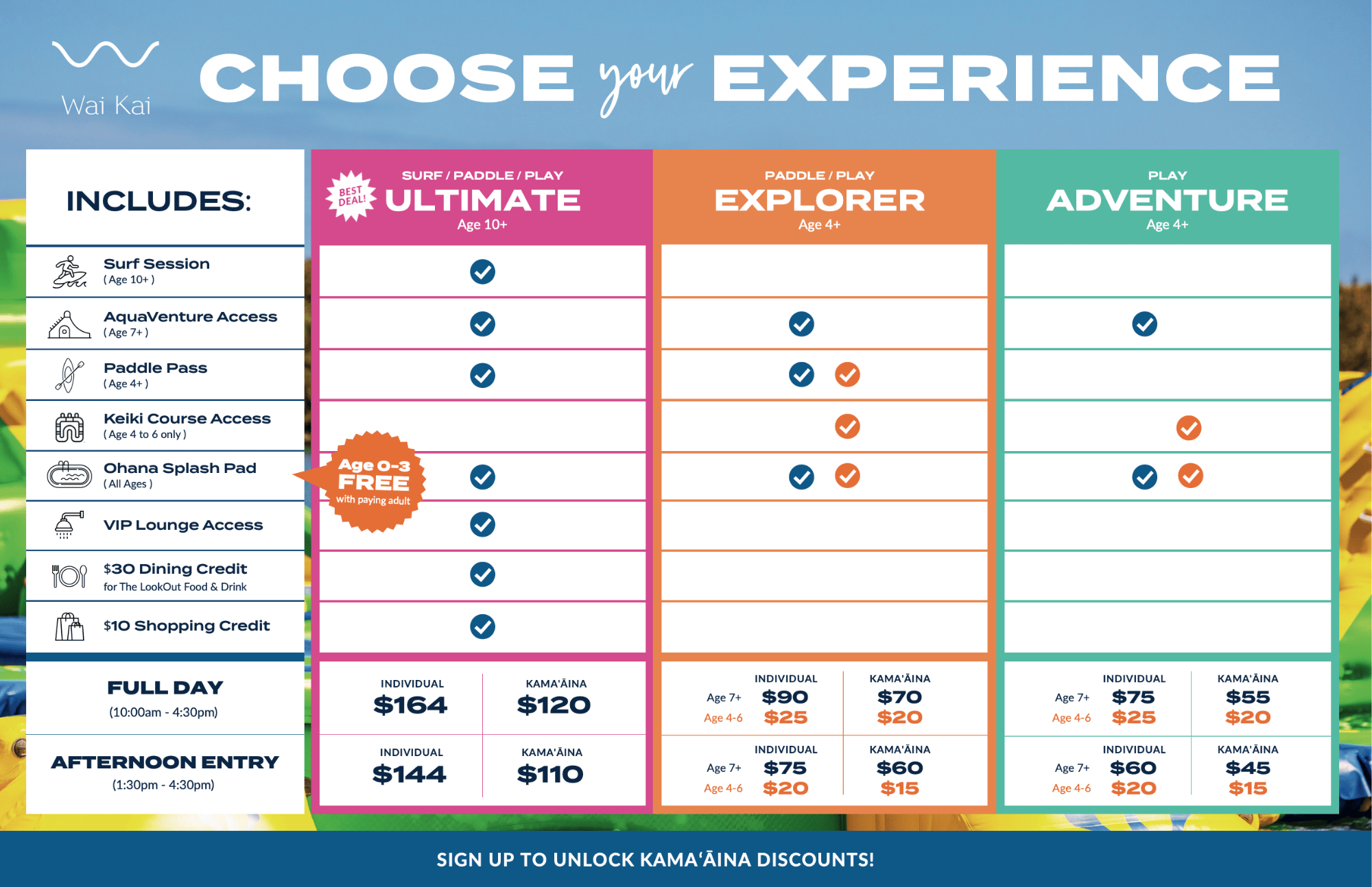 Age Suitability: The AquaVenture is suitable for ages 4 and above, with courses designated for children (Keiki Course for ages 4–6) and general admission (Aloha Course for ages 7 and up).